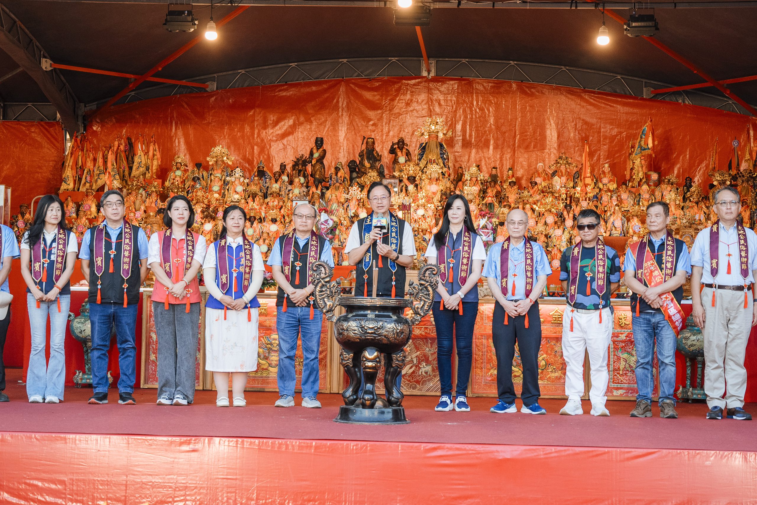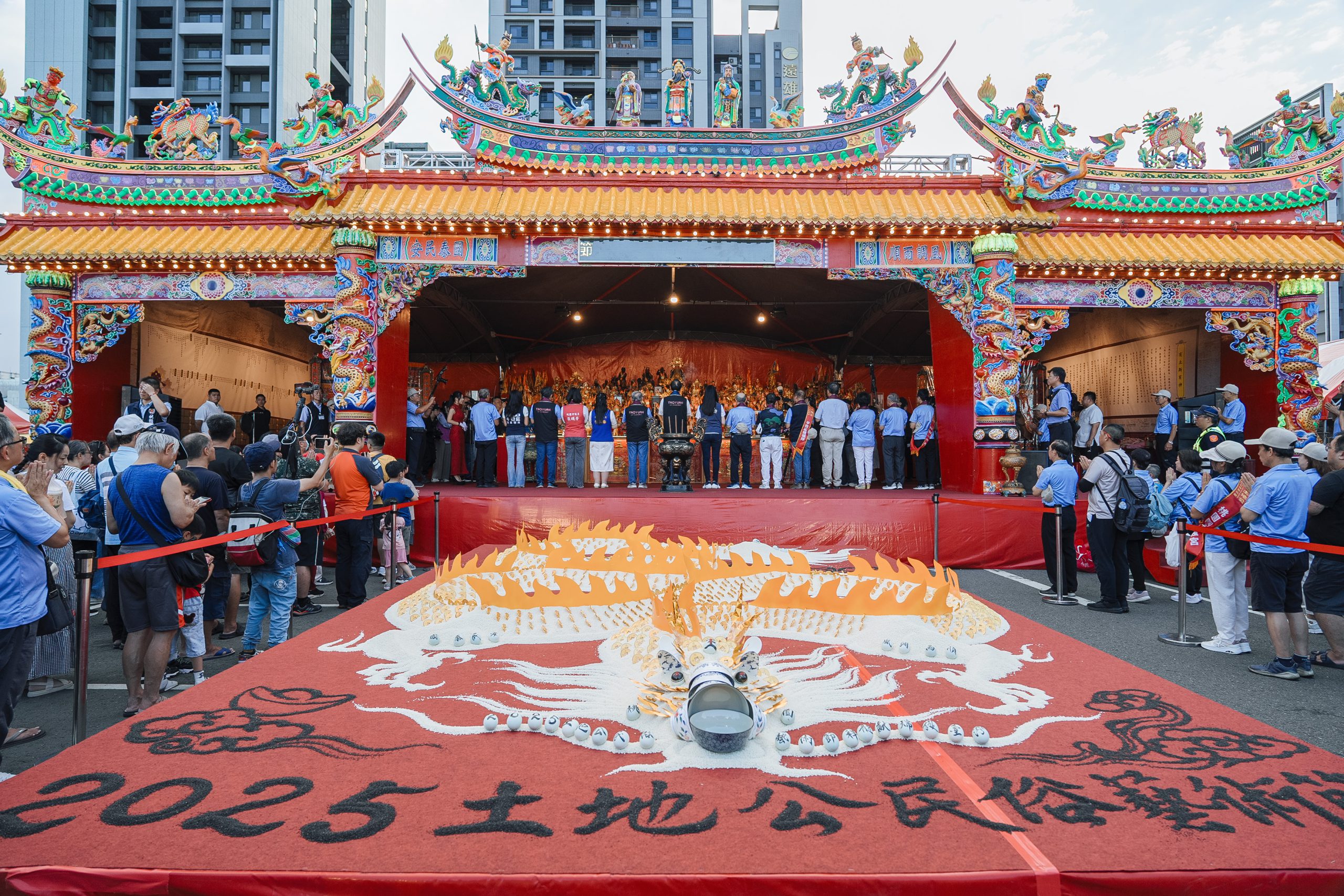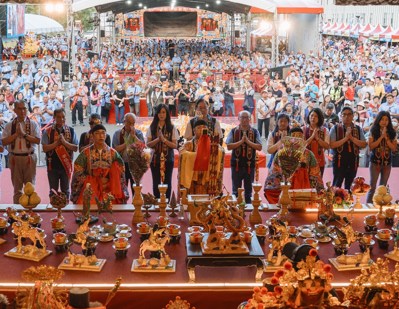在張善政市長帶領下,眾多貴賓及宮廟信眾齊聚一堂,獻花、獻果、獻財帛,為桃園市民與全體國人祈求平安順遂。